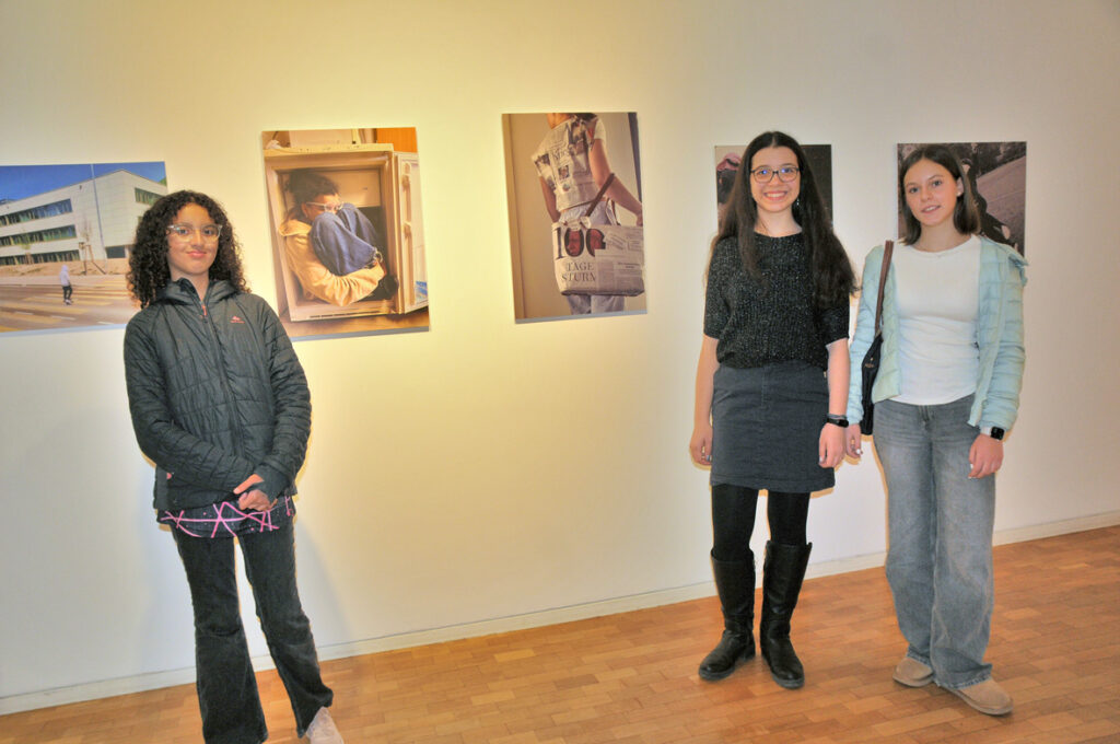 Foto (v.l.n.r.): Romaissaa Boukhlouf, Nevena Manolova und Julia Keppler vor zwei ihrer Gewinner-Bilder in der Ausstellung im Stadthaus Ulm.